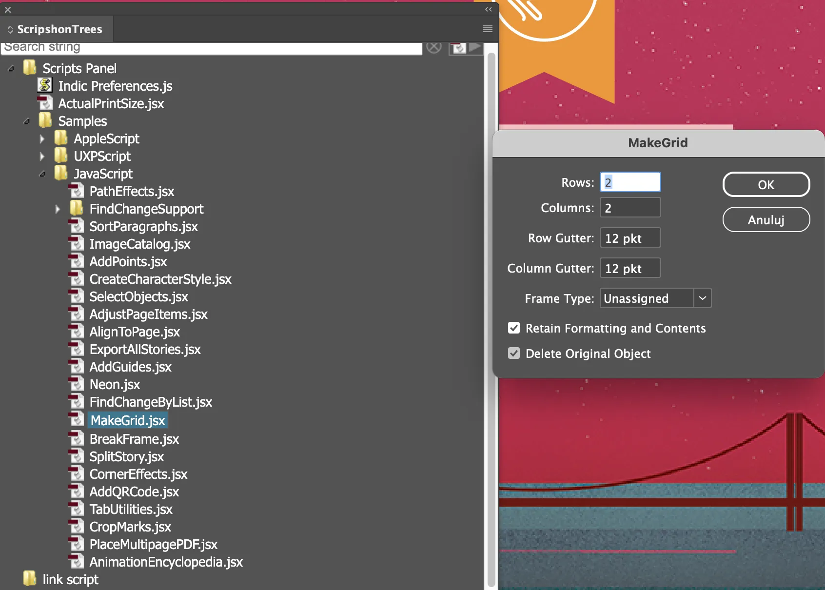 – ScripshonTree to wtyczka dzięki której można z poziomu Indesign korzystać ze skryptów napisanych w JavaScript, AppleScript lub UXPScript.