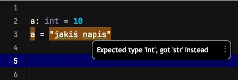 example.py:2: error: Incompatible types in assignment (expression has type „str”, variable has type „int”) [assignment]