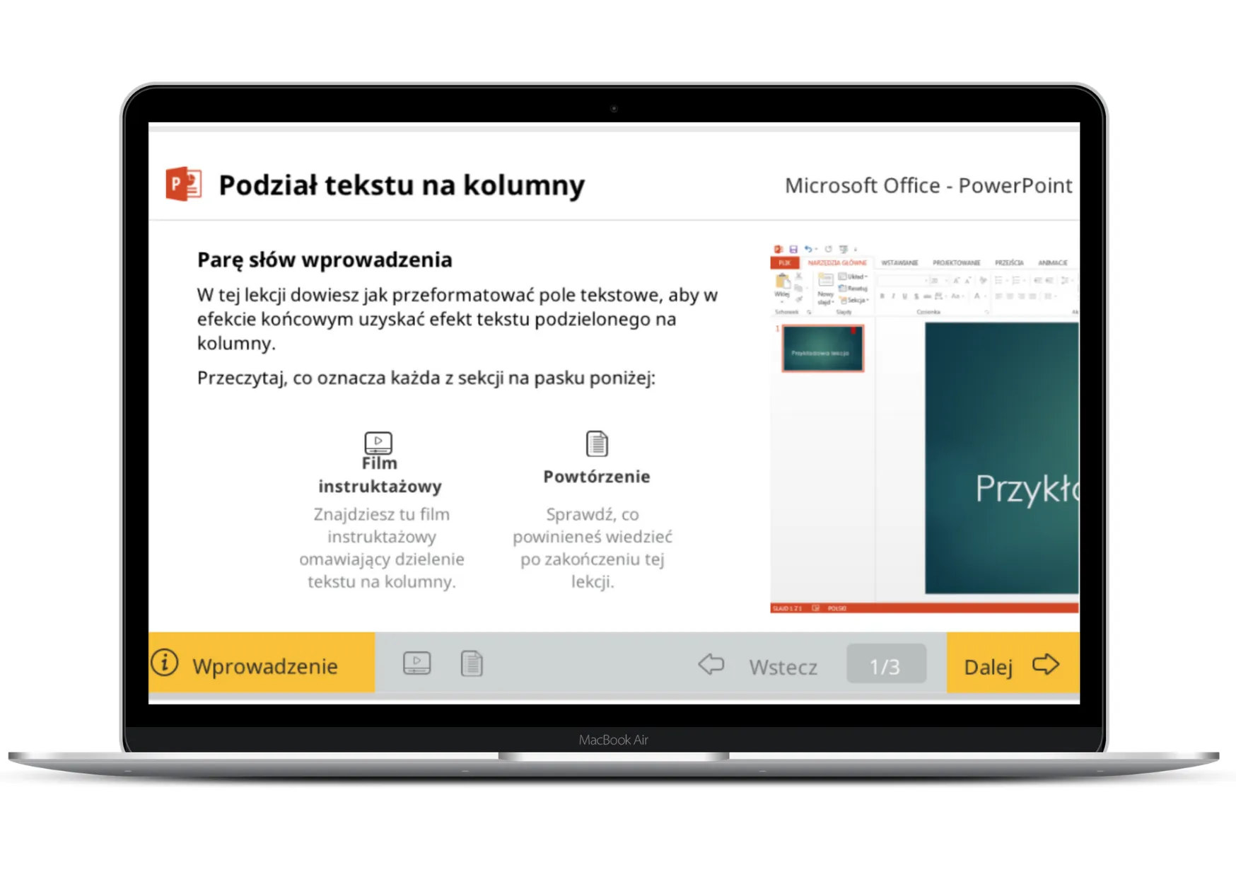 Sprawdź poniżej jak wygląda przykładowa lekcja w jednym ze szkoleń (MS Excel – poziom średniozaawansowany). Jeśli reprezentujesz swoją firmę w zakresie organizacji szkoleń oraz zarządzania platformami e-learningowymi – skontaktuj się z nami w celu uzyskania dostępów demo do całych szkoleń e-learningowych.